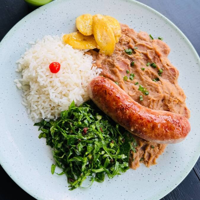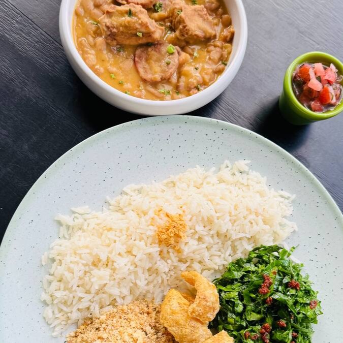 Arroz, feijão gordo ( bacon artesanal, paio e costelinha ), couve na manteiga, farofa, torresmo e vinagrete