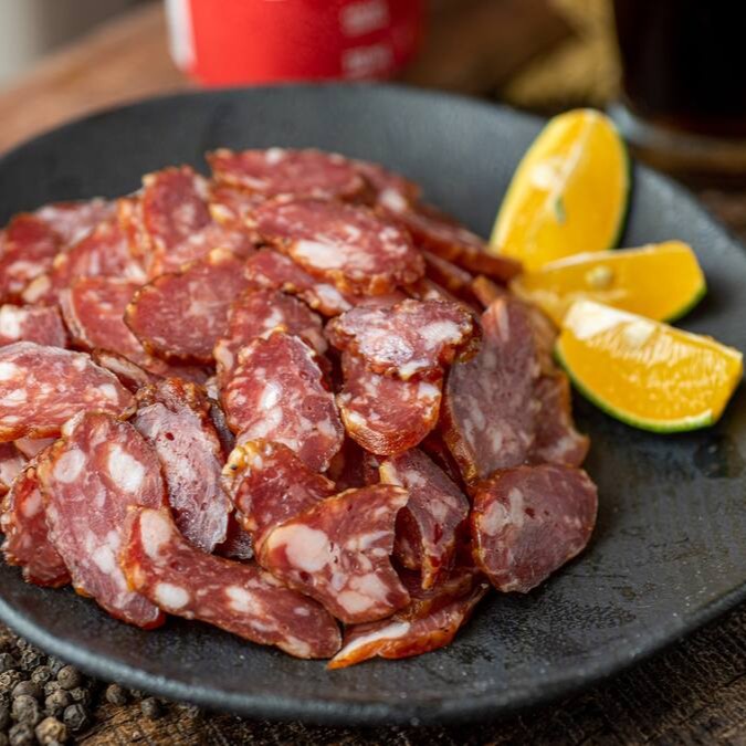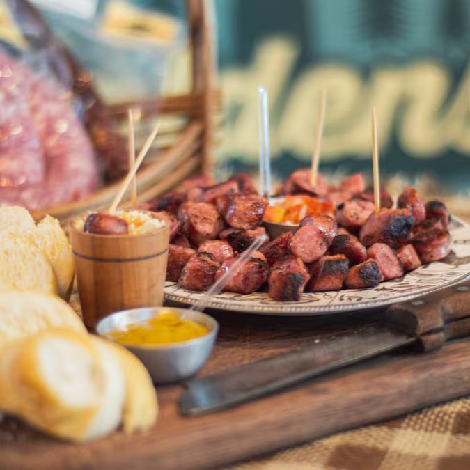 Baguette com linguiça artesanal de porco. Escolha seu molho: vinagrete ou chimichurri.