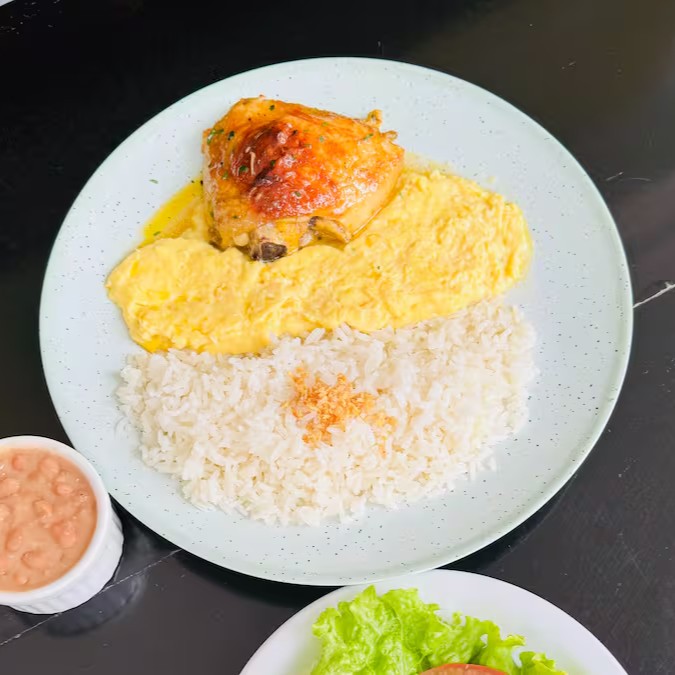 Delicioso almoço com arroz, feijão, sobrecoxa assada e creme de milho. Sabor de comida caseira.