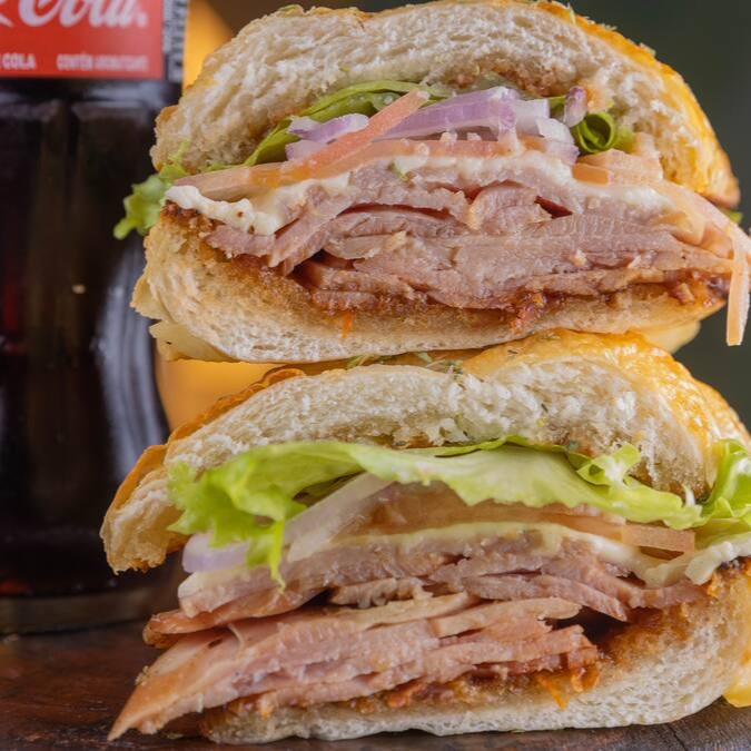 Baguette, lombo defumado, queijo canastra, tomate e alface.