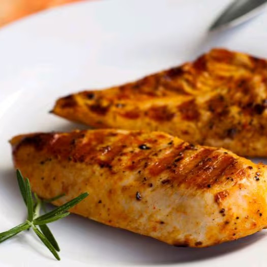 Filé de frango grelhado, macio e suculento, temperado na medida certa e grelhado até ficar dourado, realçando todo o sabor.