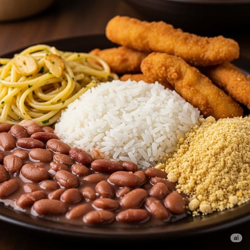 Acompanhe Aqui a Montagem dessa Refeição: Começamos com um Feijão Carioca muito Saboroso e seguimos com um Arroz Soltinho, Acompanhado de um Delicioso Macarrão Alho e Óleo ao lado de uma Farofinha sabor bacon e para finalizar nossas deliciosas Iscas de Frango.