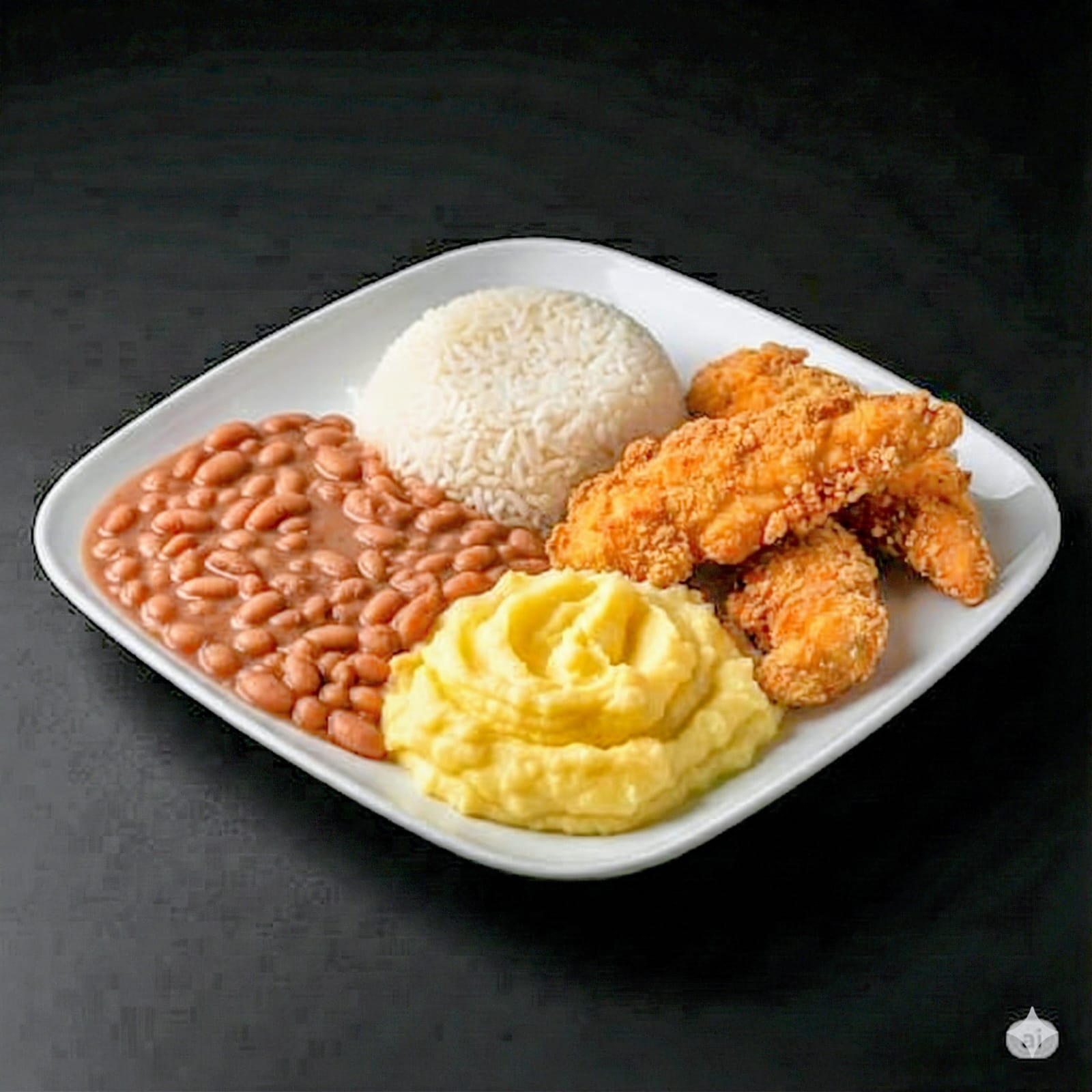 Conheça nossa Montagem dessa Maravilhosa Refeição : Iniciando com um Saboroso Feijão Carioca e Logo acima nosso Arroz Soltinho e Para Finalizar nosso suculento Purê de Batata e juntamente com nossas marcantes Iscas de Frango.