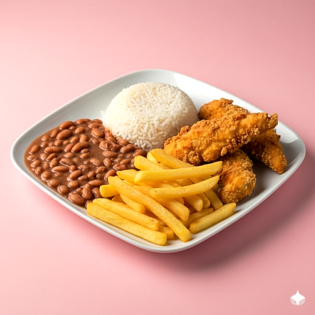 Essa Deliciosa Refeição é montada de seguinte forma: Um especial Feijão Carioca, Acompanhado de um super Arroz bem Soltinho e temos também uma deliciosa batata palito para acompanhar nossas maravilhosas Iscas de Frango