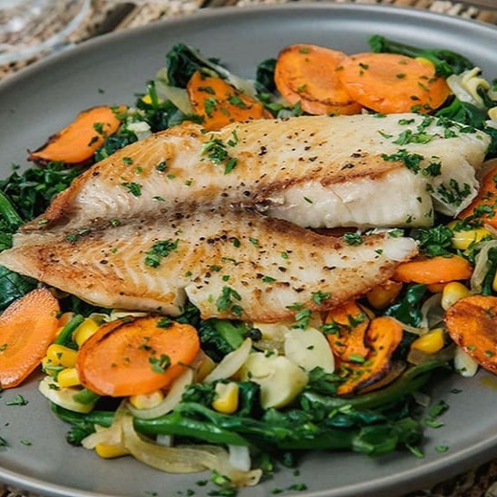 Tilápia grelhada com legumes, arroz, feijão e salada. Leve, nutritiva e cheia de sabor!