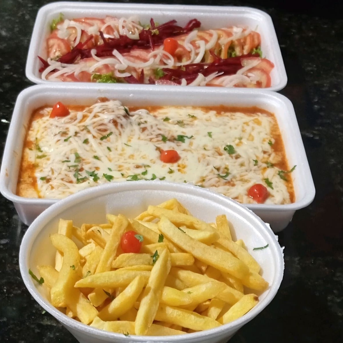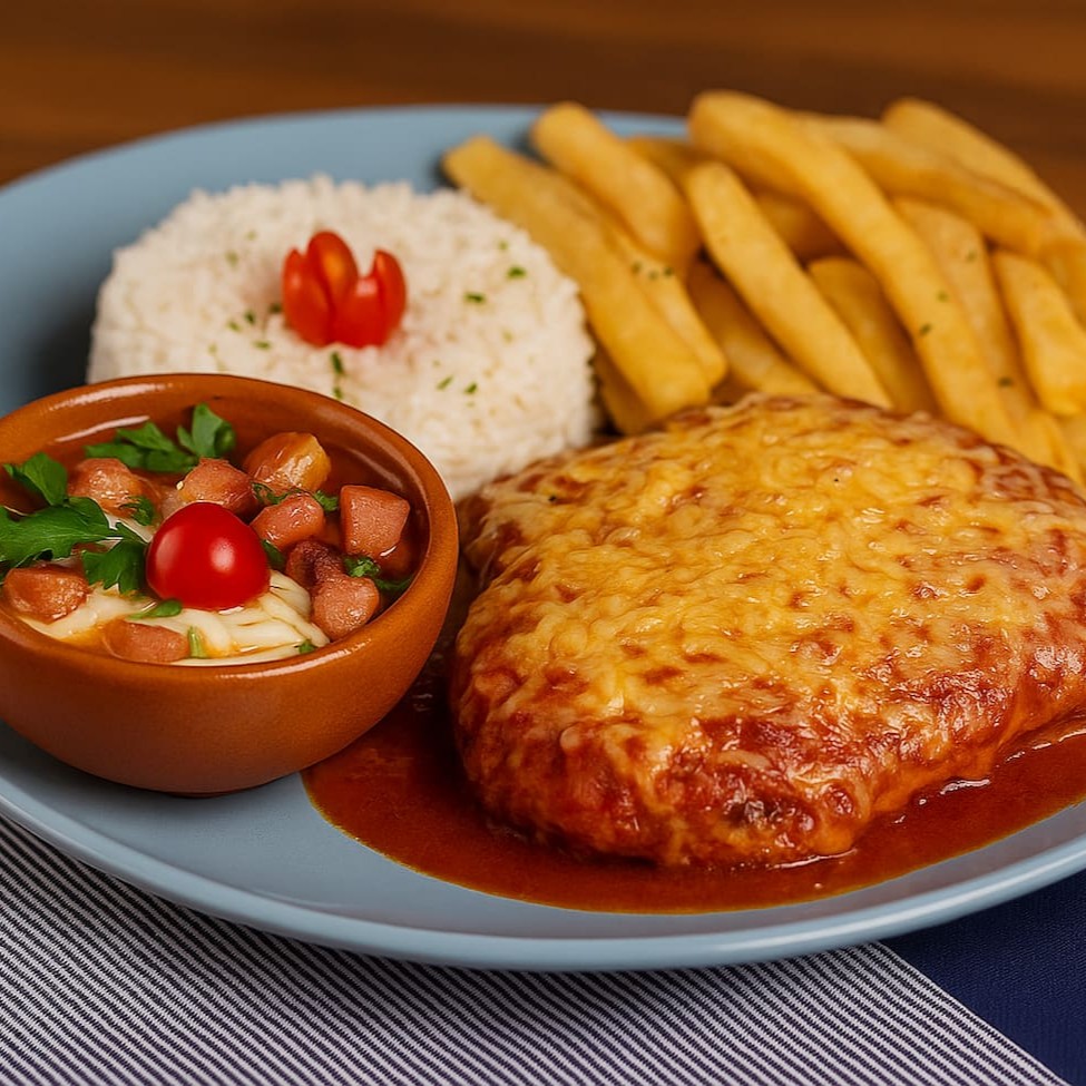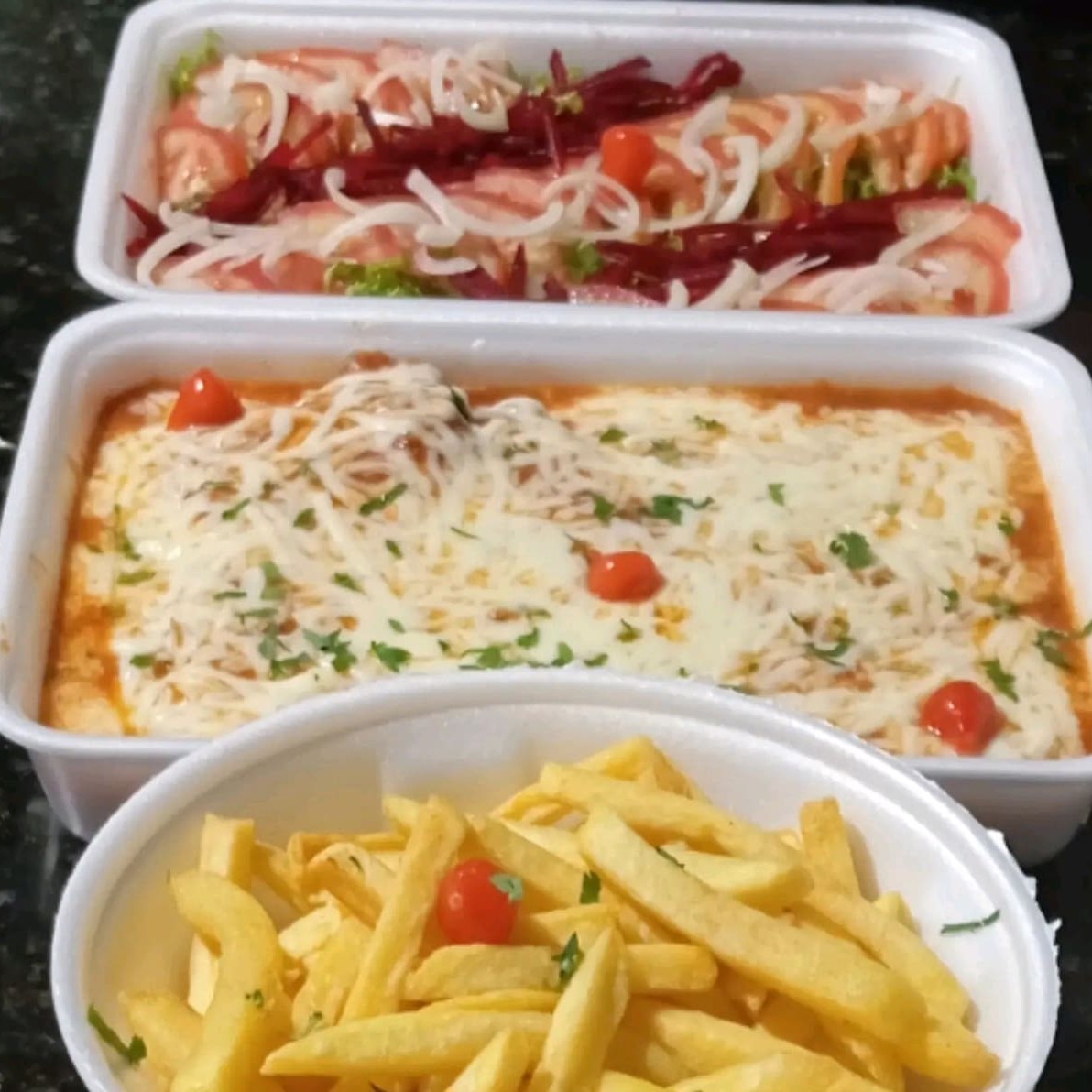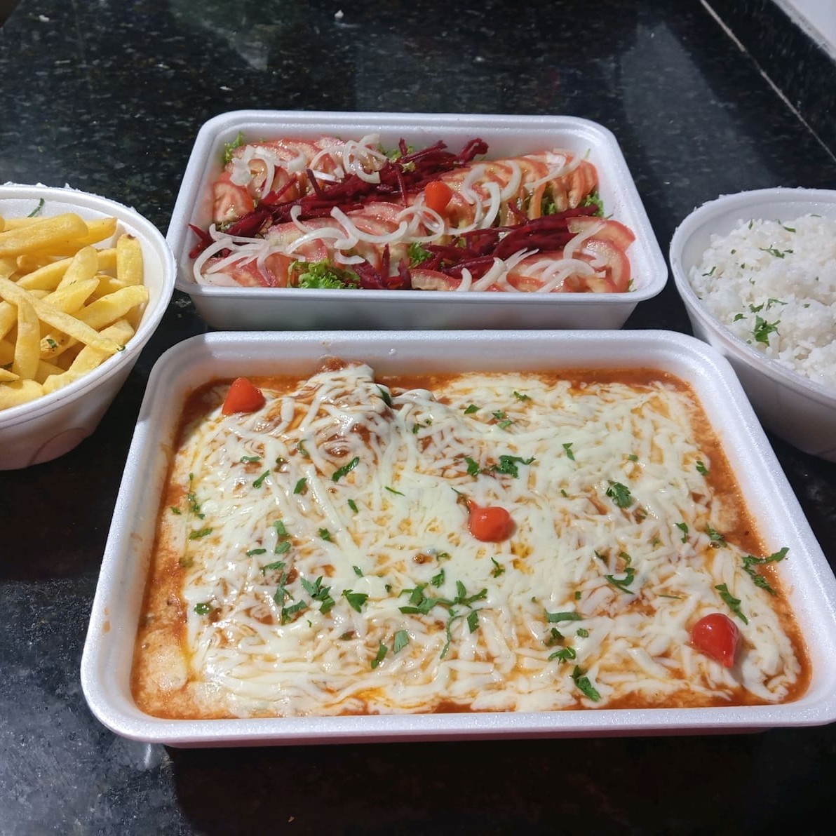 Arroz, parmegiana de alcatra com4bifes feito com molho artesanal, fritas,salada