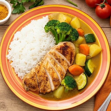 Frango com legumes no capricho, acompanhado de arroz, feijão e salada fresquinha. Leve, saboroso e completo!