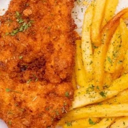 400gramas de frango empanado acompanha 200gramas de fritas e molho da casa