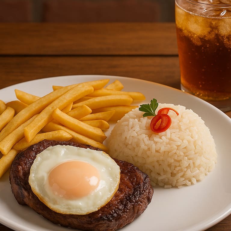 Bife a cavalo com arroz, feijão e fritas, acompanhado de uma Gabel 350ml geladíssima. Combinação perfeita pra matar a fome!