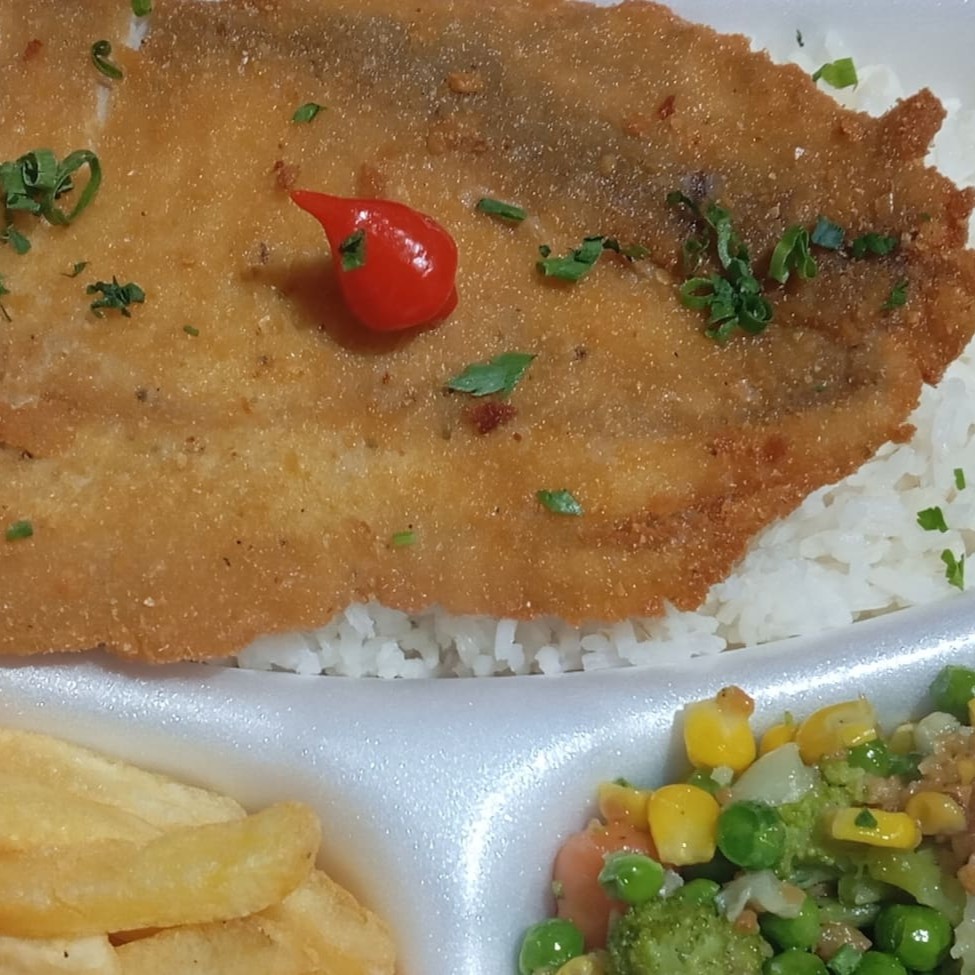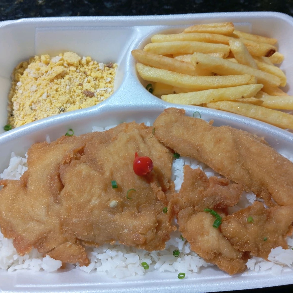 Arroz, feijão, tilápia empanada ,fritas, farofa