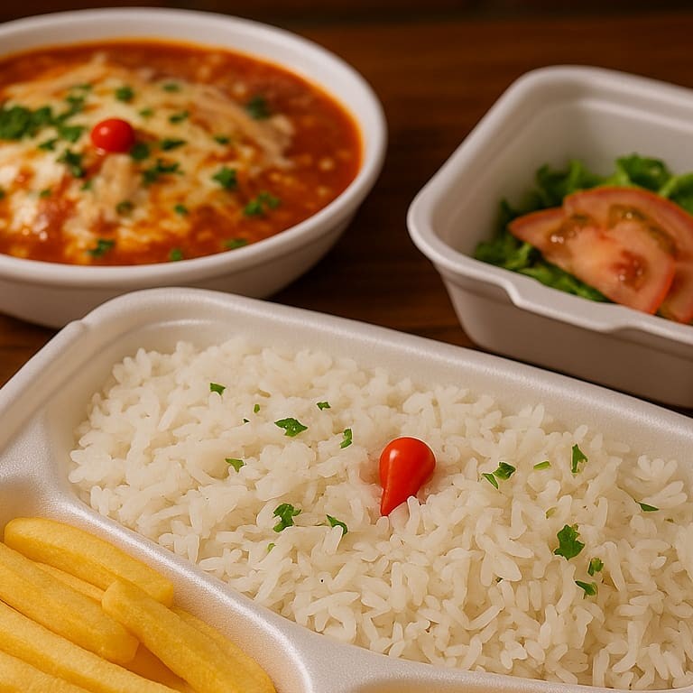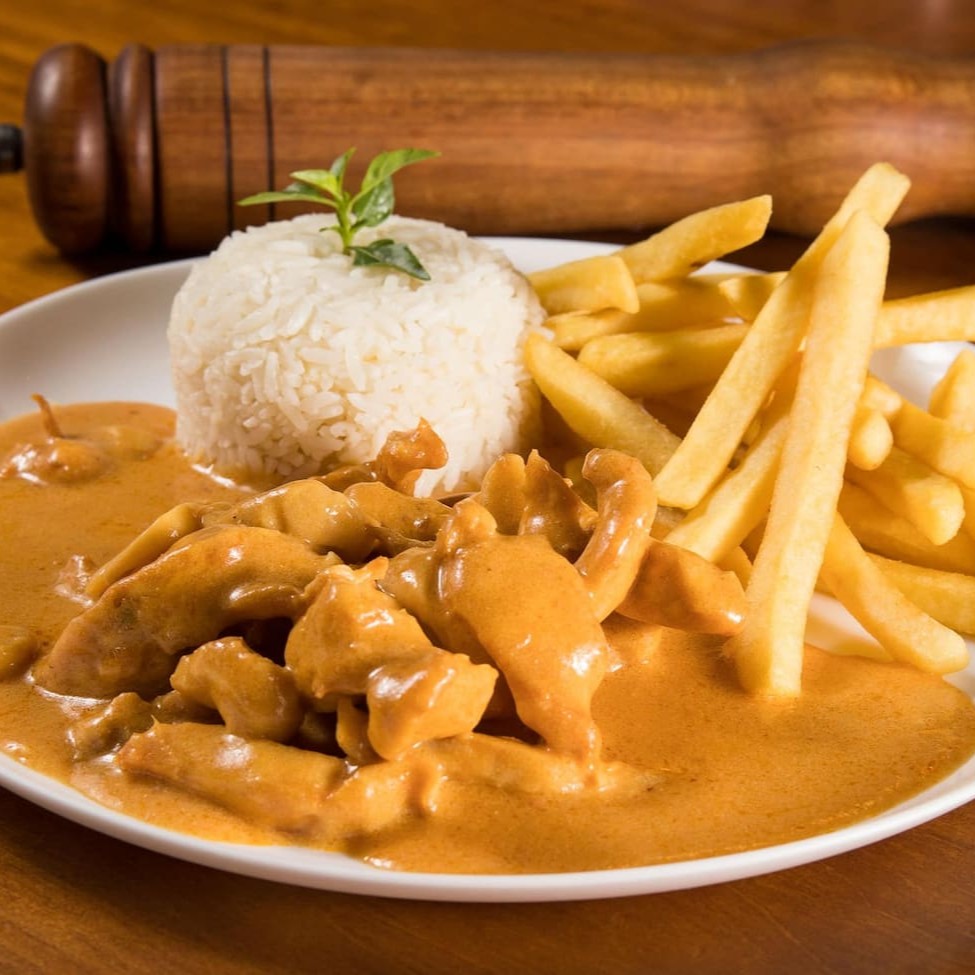 Marmita com delicioso filé de frango ao molho estrogonofe acompanhado de arroz branco e batatas fritas Marmita indicada para 01 pessoa.