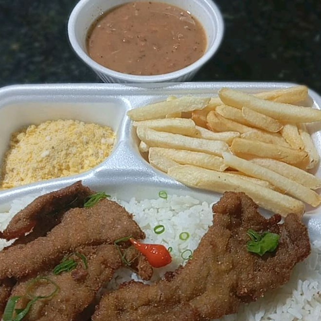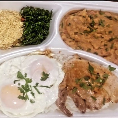 Acompanha: Arroz, tutu, ovo, couve, farofa e bife pernil.