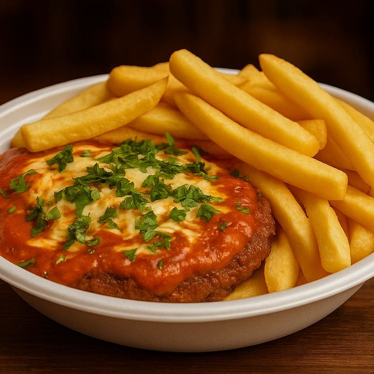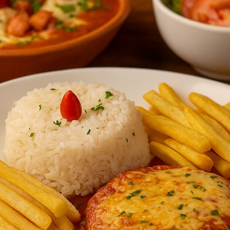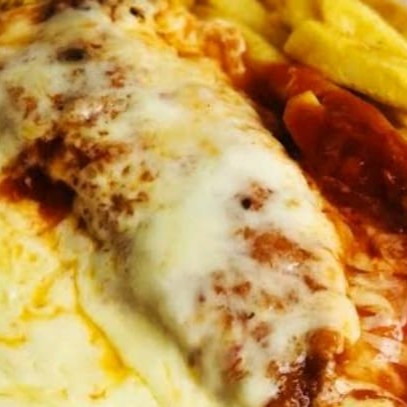 Parmegiana de Tilápia Filé de tilápia empanado ao molho artesanal e queijo gratinado, servido com arroz soltinho, fritas crocantes e salada fresquinha. Leve e saboroso!