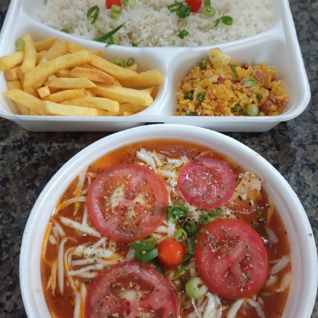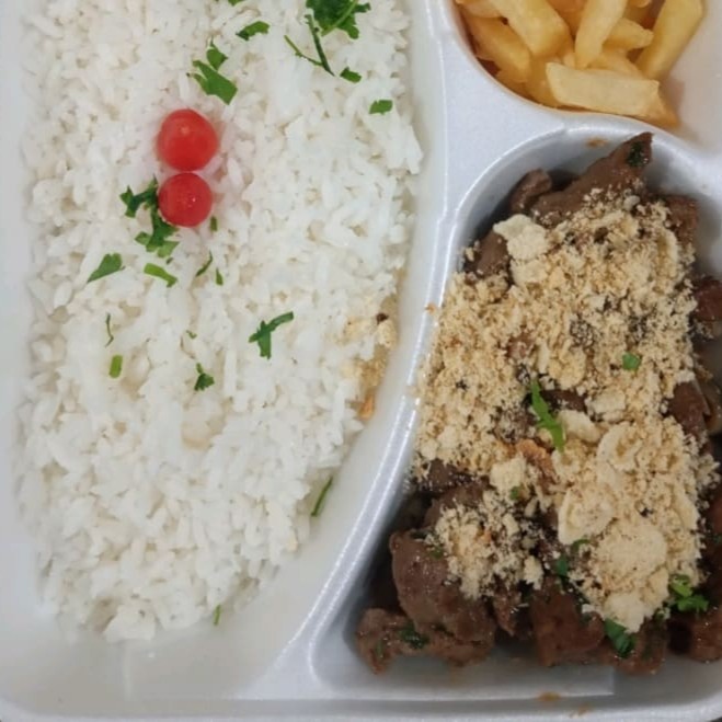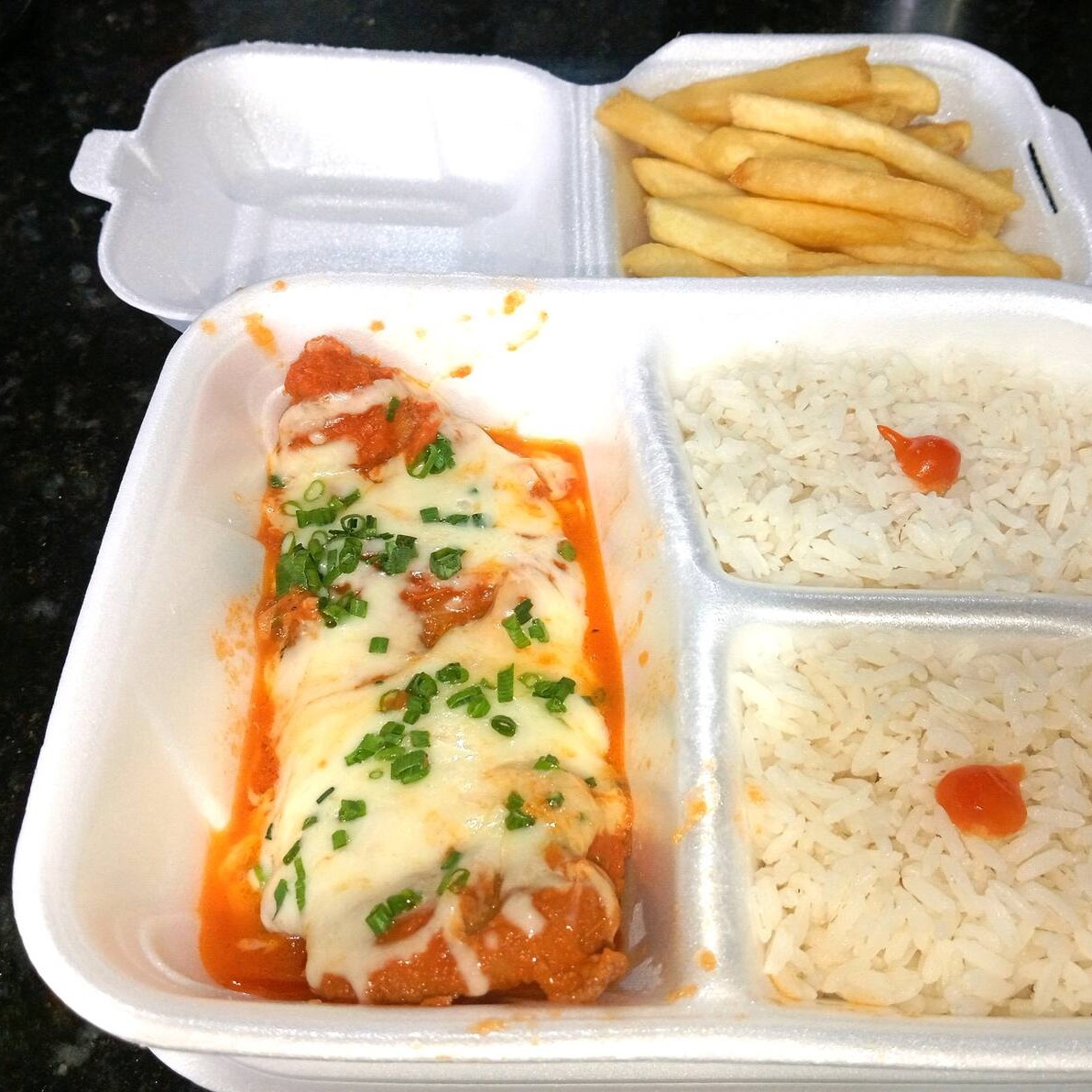 Marmita com delicioso filé de frango grelhado acompanhado de arroz branco, feijão e batatas fritas. Marmita indicada para 01 pessoa.