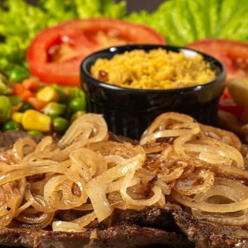 Bife acebolado com legumes, arroz, feijão, fritas crocantes, farofa da casa e salada. Sabor caseiro que faz a diferença!