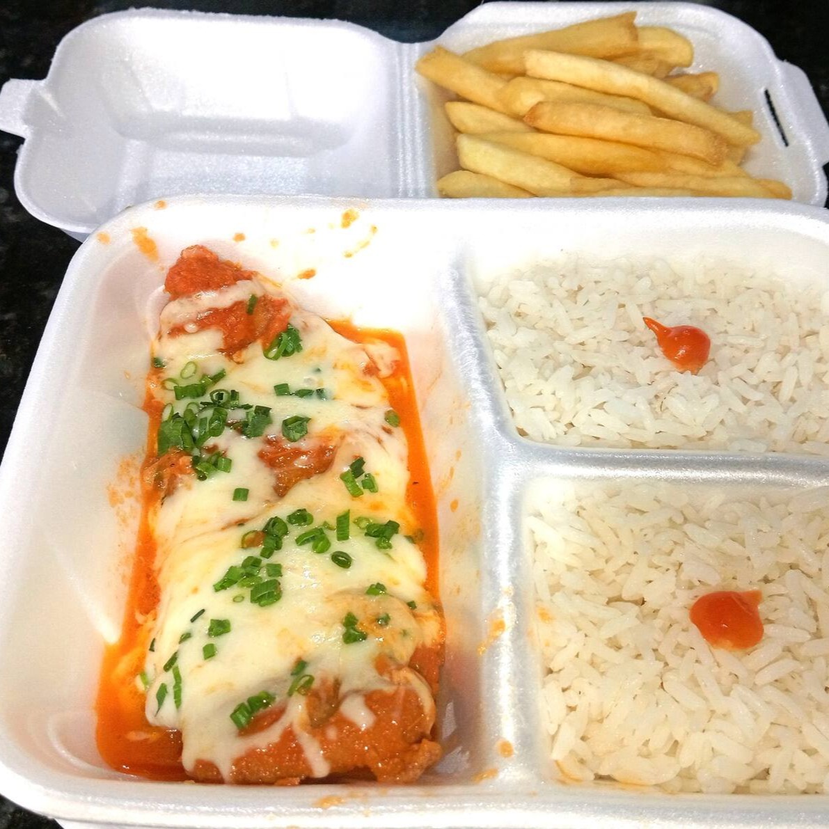 Arroz, parmegiana de frango com 4 bifes feito com molho artesanal, fritas, salada
