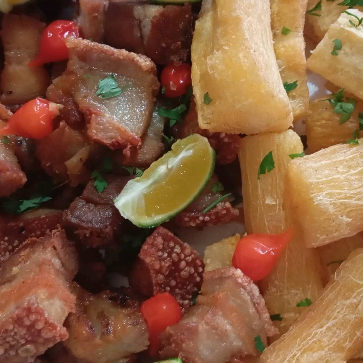 Arroz, feijão,pernil acebolado,fritas,farofa, salada