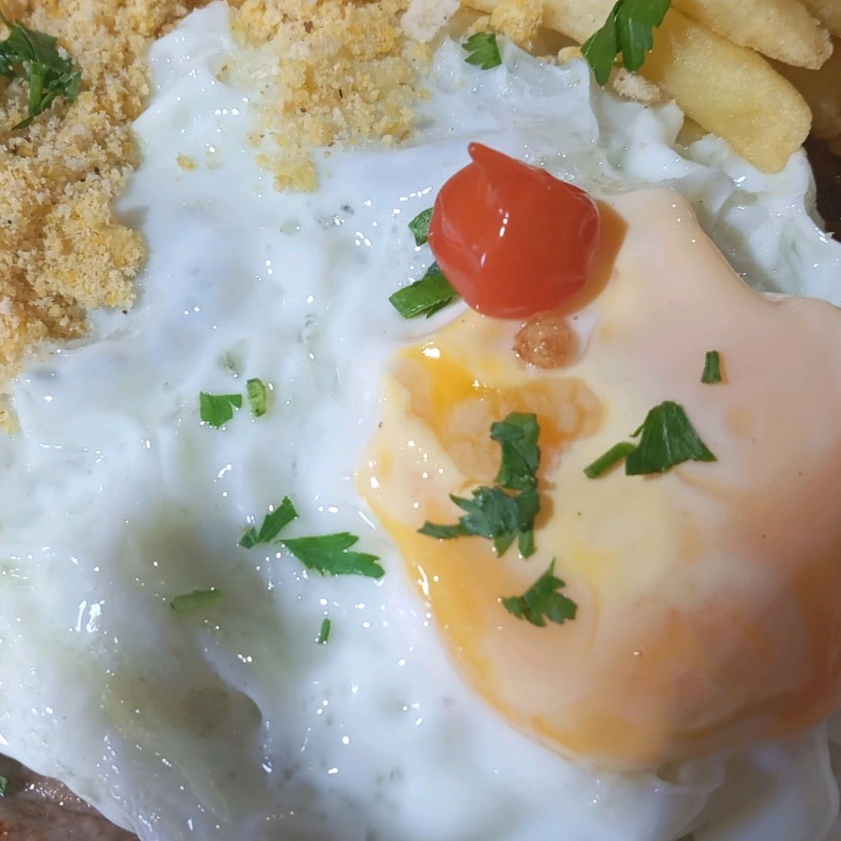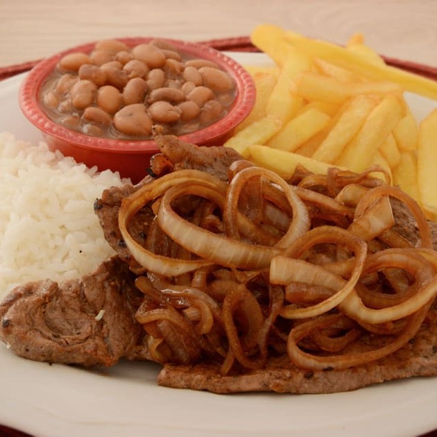 Bife acebolado suculento com arroz, feijão, fritas,farofa da casa