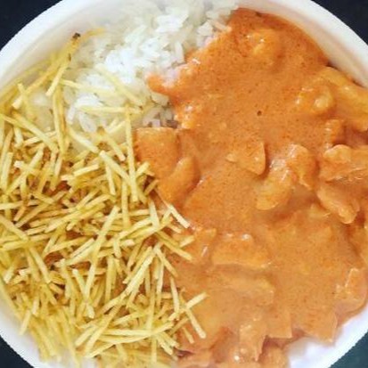 Strogonoff de frango com arroz branco e batata palha.