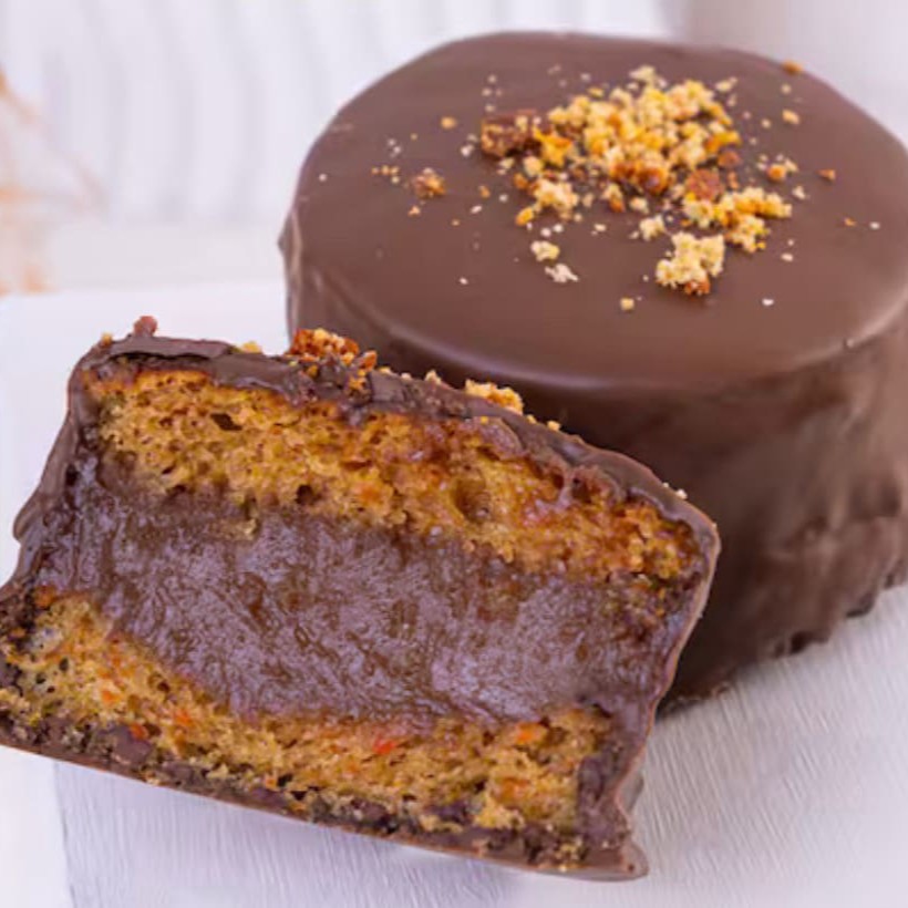 Bolo de cenoura com brigadeiro de whey e cobertura de chocolate sem açúcar. Fornece 13g de proteína, poucas calorias, baixo sódio, menos lactose e sabor caseiro.