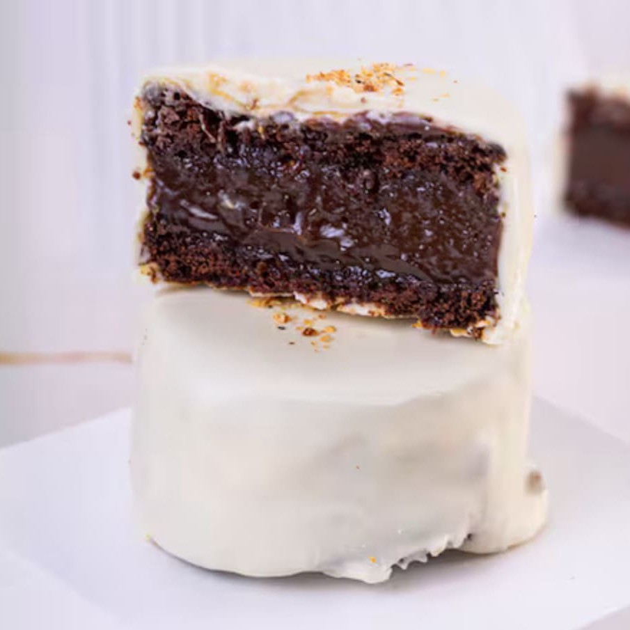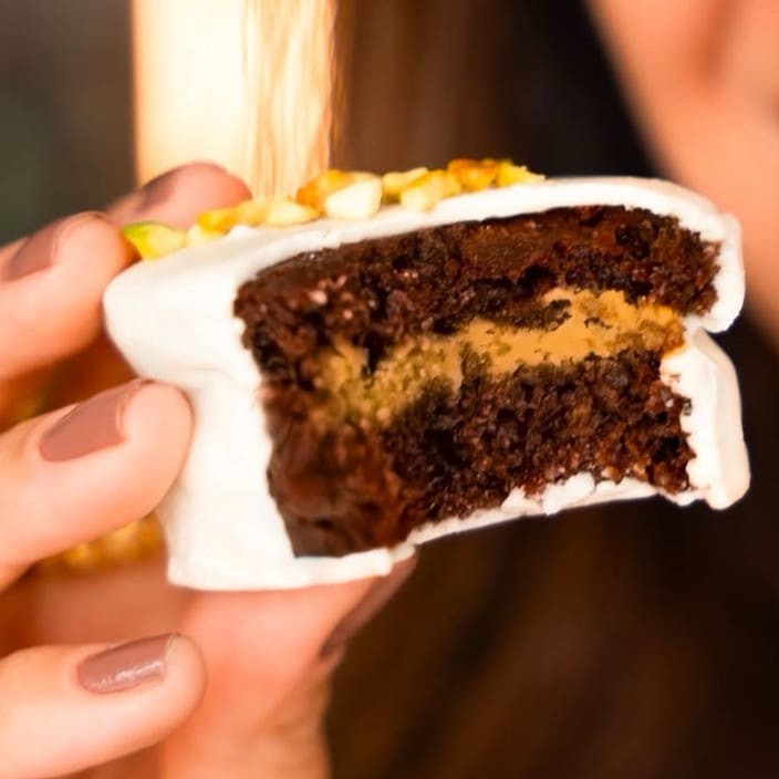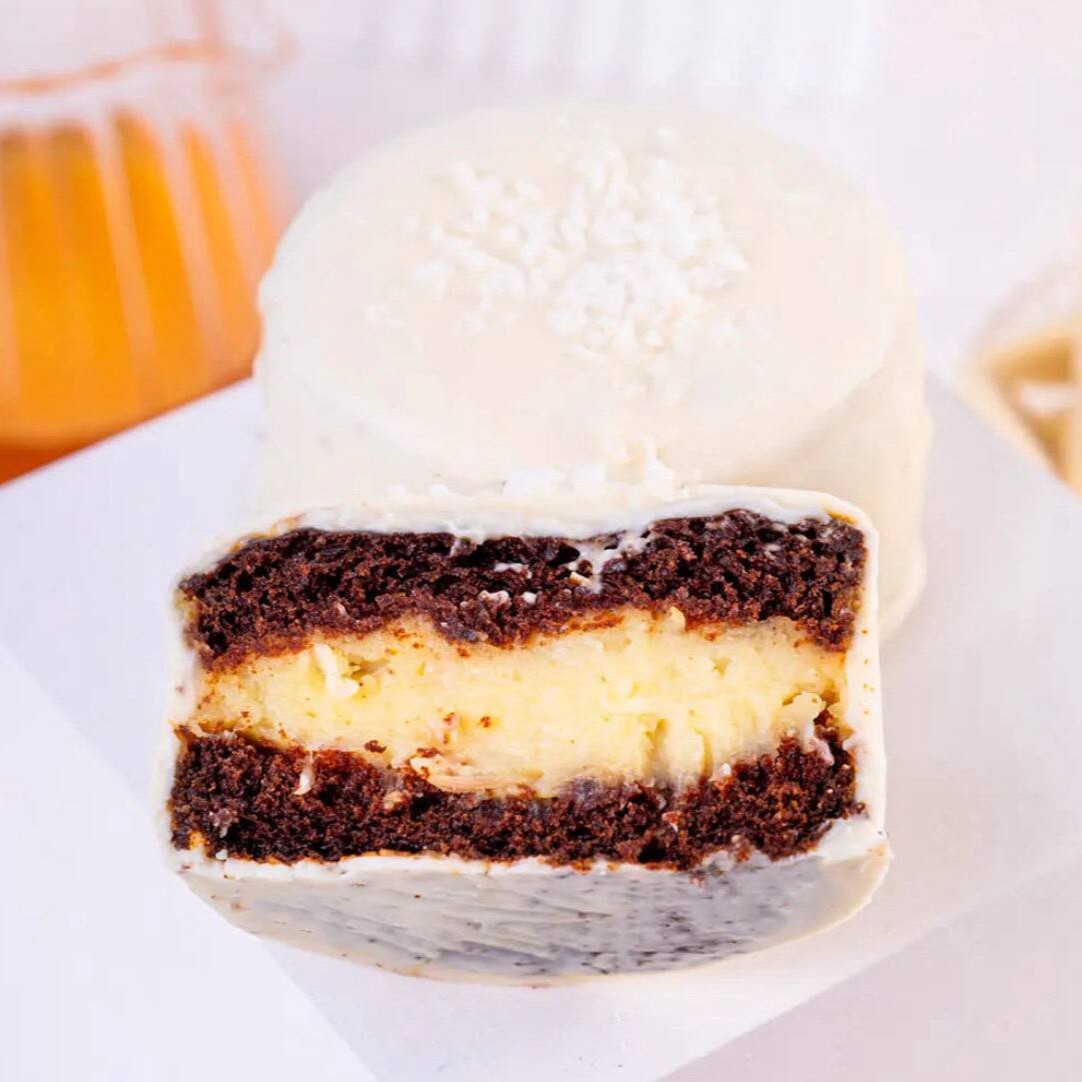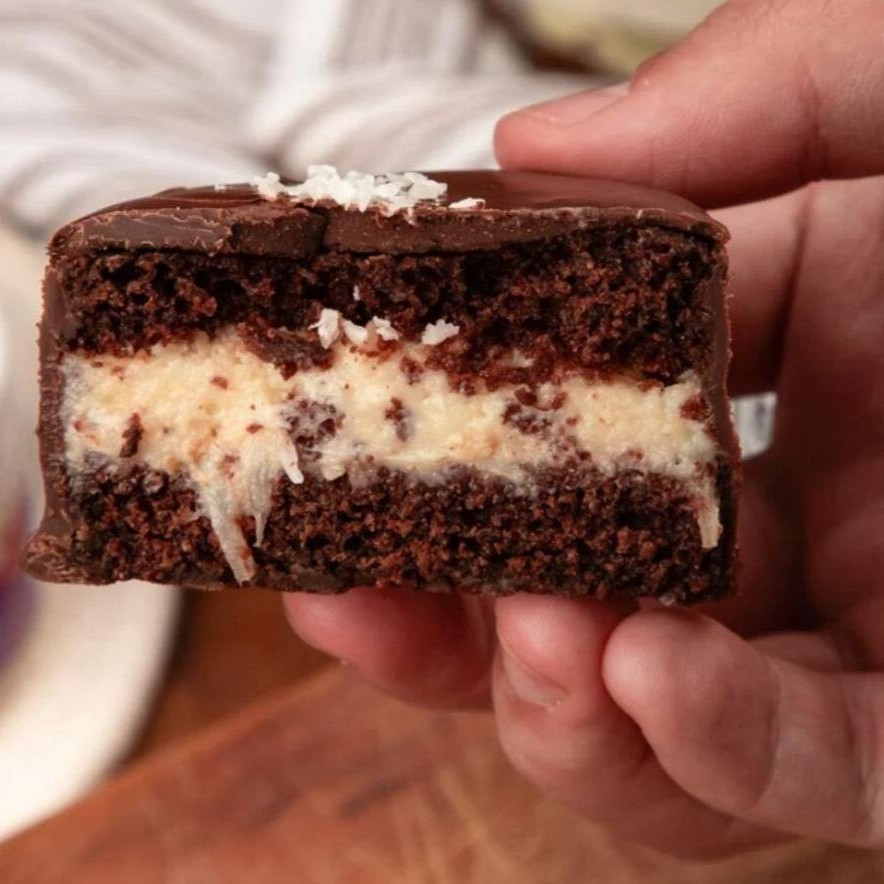 com uma massa de pão de mel fofinha, recheada com beijinho cremoso de coco e finalizada com uma camada generosa de chocolate branco zero adição de açúcar.