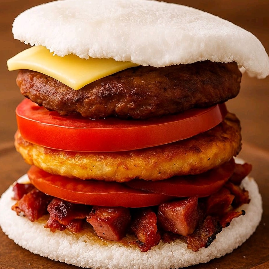 Crepioca dourada na chapa, recheada com hambúrguer artesanal suculento, queijo bem derretido e bacon crocante