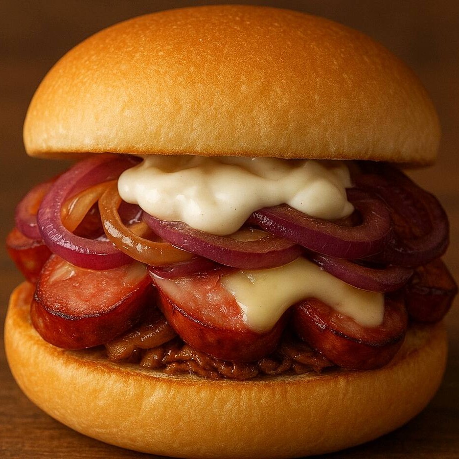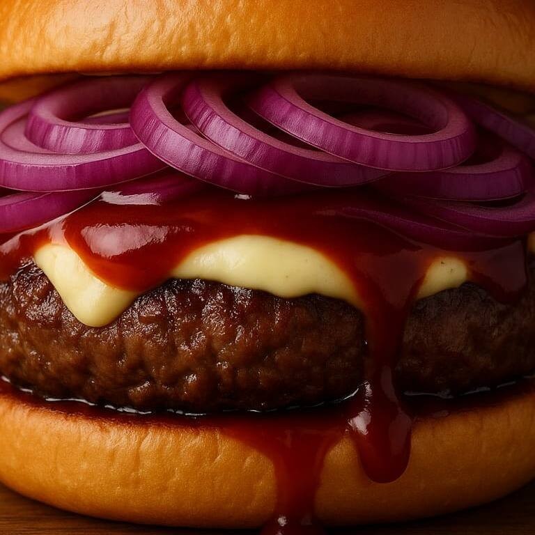 Hambúrguer artesanal, alto e suculento, grelhado na chapa para garantir aquela crostinha dourada por fora e maciez por dentro. Coberto generosamente com Catupiry , que derrete sobre a carne criando uma camada ultra cremosa. Finalizado com molho barbecue especial de sabor levemente defumado e toque adocicado.