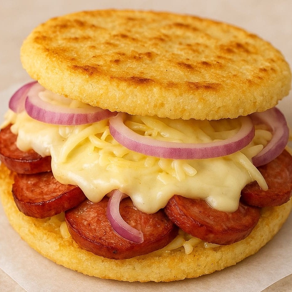 Crepioca dourada na chapa, recheada com calabresa frita, queijo derretido e cebola roxa refogada