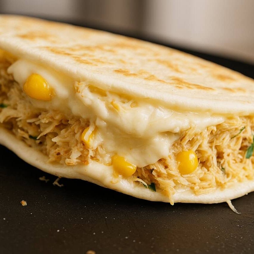 Tapioca artesanal recheada com frango desfiado cremoso com milho e requeijão/ Catupiry