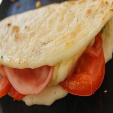 Crepioca fininha com mussarela derretida, tomate, orégano e presunto, trazendo o sabor da pizza direto pra sua Mc’Oca