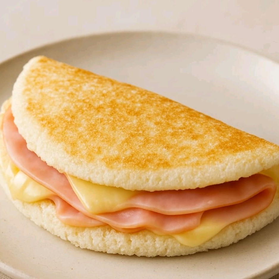 Crepioca fininha recheada com presunto saboroso e mussarela derretida, simples, quentinha e gostosa'