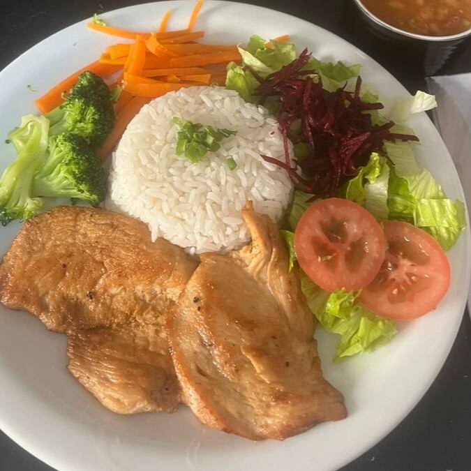 O Filé de Frango grelhado é acompanhado de arroz, feijão, batata chips e salada.