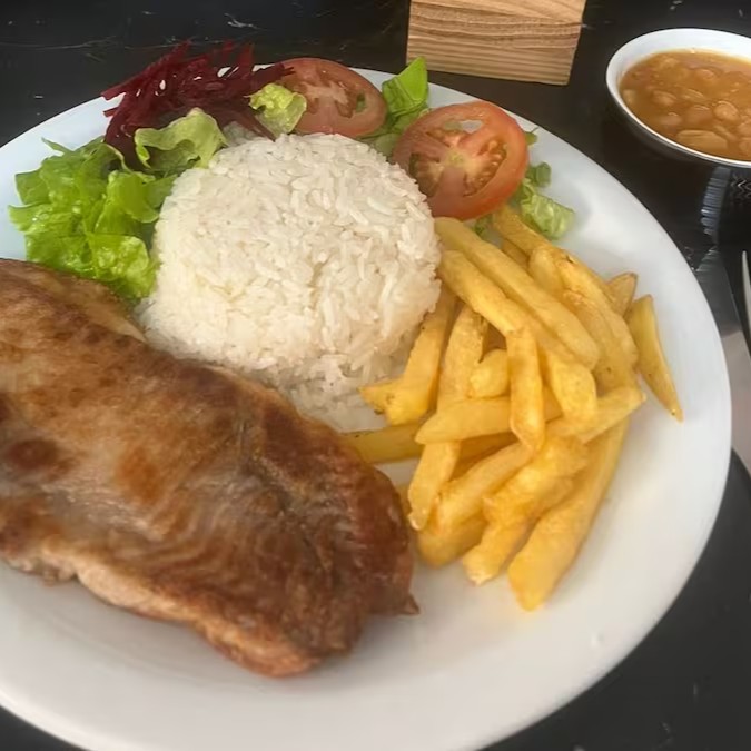O Frango à Milanesa acompanhado de arroz, feijão, batatas chips e salada.