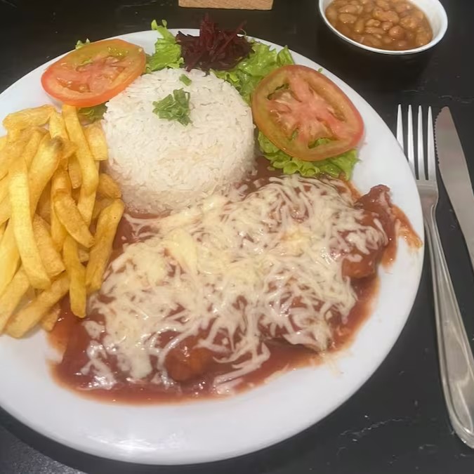 Frango à Parmegiana é uma deliciosa combinação de sabores. O frango, cuidadosamente empanado e frito, coberto com um molho de tomate e queijo derretido, acompanhado de um arroz fresco, batatas chips uma salada fresca.