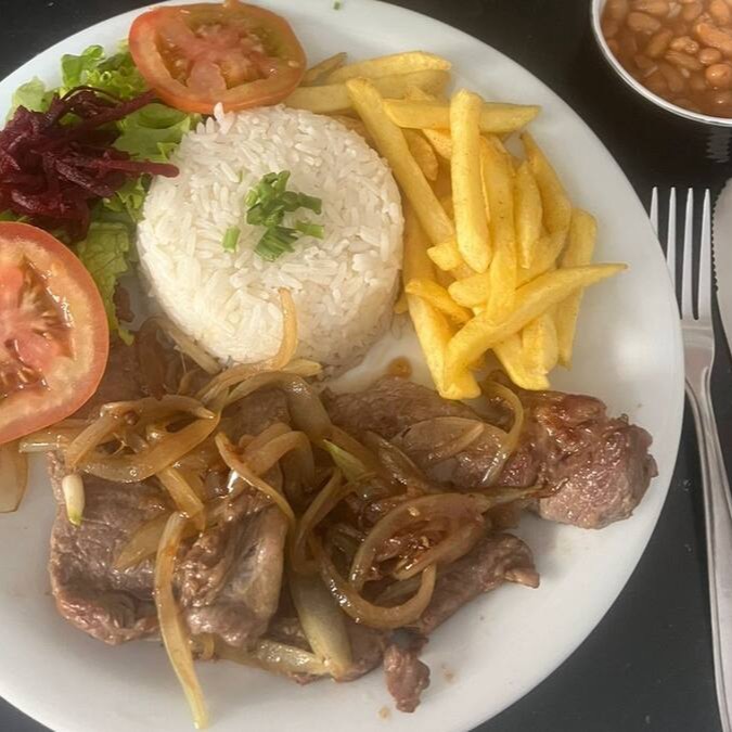 Esse prato é acompanhado de arroz, feijão, batata chips e salada.