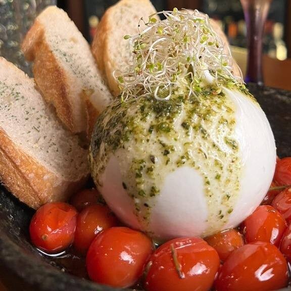 Burrata italiana cremosa servida com tomates confit lentamente assados, azeite extravirgem e manjericão fresco, acompanhada de pães artesanais crocantes.