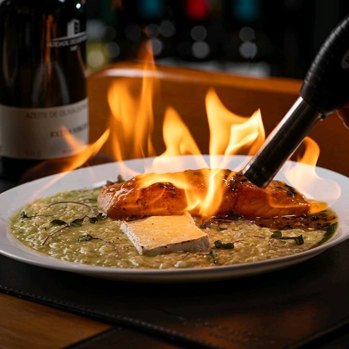 Salmão grelhado no ponto certo, servido com molho de maracujá levemente agridoce e acompanhado de risoto de brie cremoso e sofisticado.