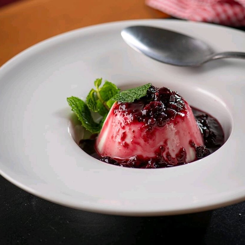 Panacota de baunilha leve e delicada, servida com calda caseira de frutas vermelhas frescas. Sobremesa clássica e elegante, perfeita para adoçar seu momento.