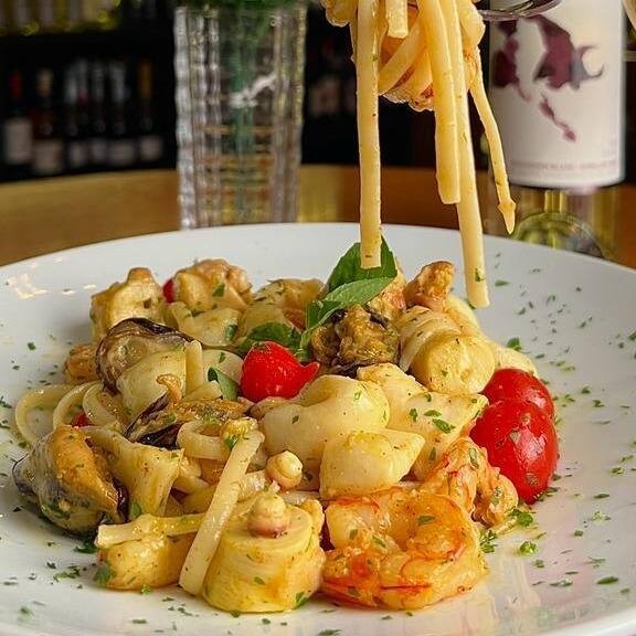 Massa fresca com camarões salteados em delicado molho de champagne.