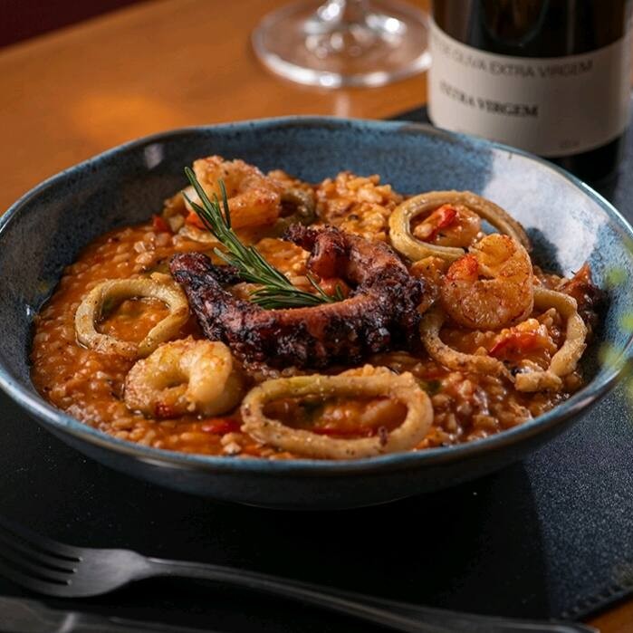 Risoto cremoso preparado com caldo artesanal e frutos do mar selecionados, finalizado na manteiga para uma textura aveludada e sabor marcante.