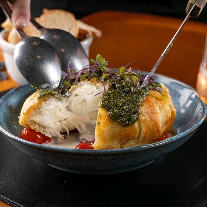Burrata envolta em massa folhada dourada, acompanhada de tomates confit e torradas artesanais.