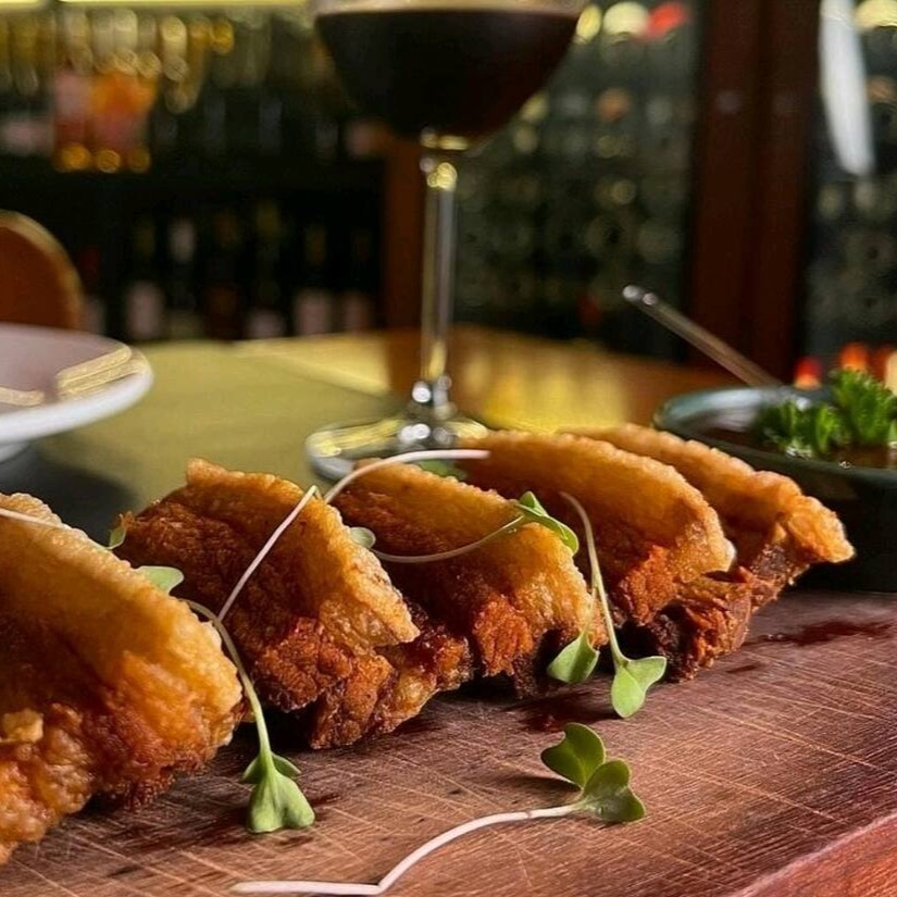 Pancetta assada no ponto certo: dourada por fora, macia por dentro. Finalizada com molho chili de goiabada, que entrega aquele contraste irresistível entre o doce e o levemente picante.