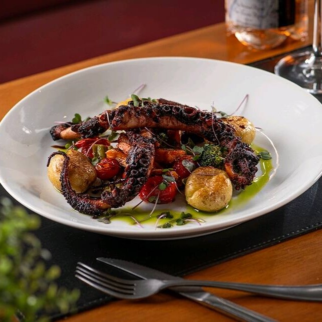 Polvo grelhado na brasa, regado ao azeite extravirgem, acompanhado de cebola dourada e batatas ao murro. Prato intenso, rústico e cheio de personalidade