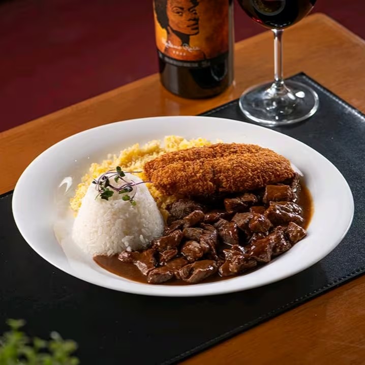 Cubos de Angus salteados, acompanhados de farofa de ovos, arroz branco, feijão e banana frita.