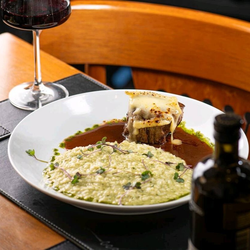 Medalhão de filé mignon coberto com queijo brie maçaricado, servido com risoto de pesto envolvido em molho demi-glace. Uma combinação intensa e sofisticada.