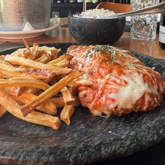 Corte Angus empanado, coberto com molho de tomate artesanal e queijo gratinado.