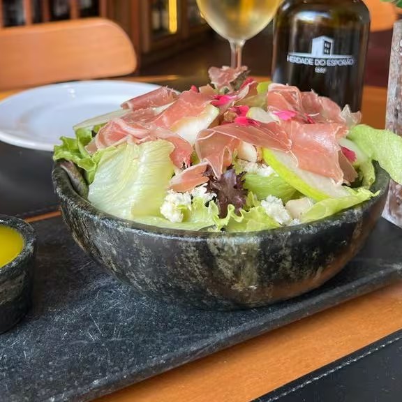 Uma salada cheia de personalidade. Folhas selecionadas, maçã fatiada trazendo frescor, mix de castanhas crocantes, presunto Parma e um molho de mostarda com mel que equilibra perfeitamente o doce e o salgado.