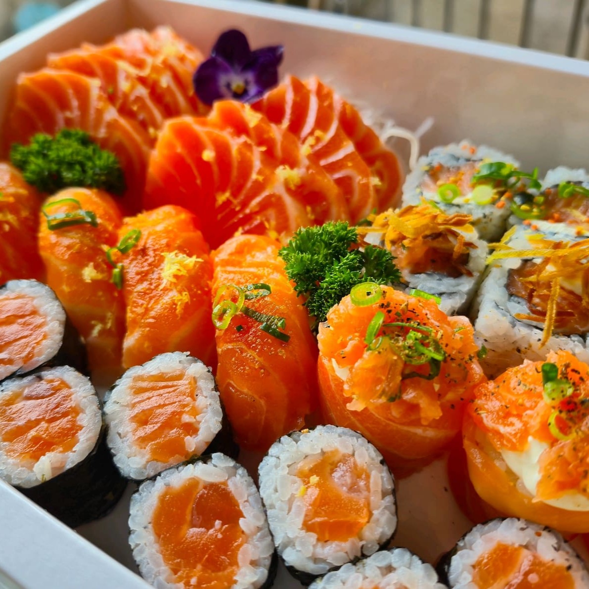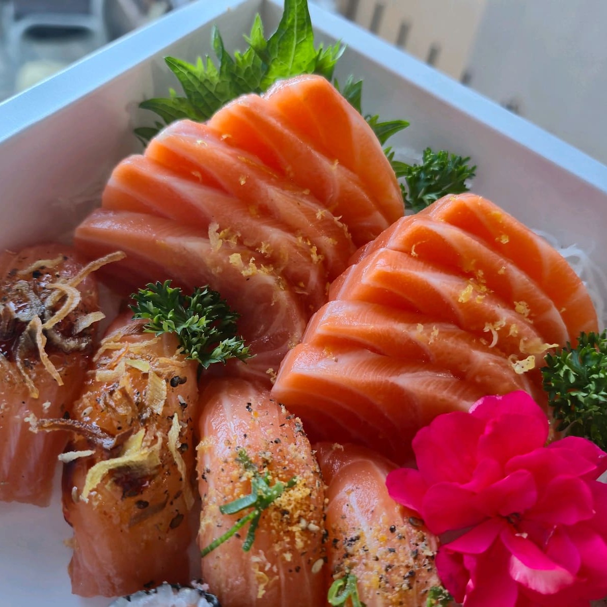 4 sashimi salmão 8 uramaki salmão grelhado 4 niguiri salmão 2 djo salmão