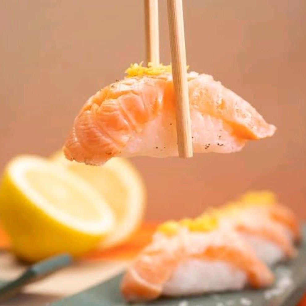 Delicioso niguiri de salmão finalizado com shoyo trufado com raspa de limão siciliano ,raspa de ovas de tainha e azeite trufado