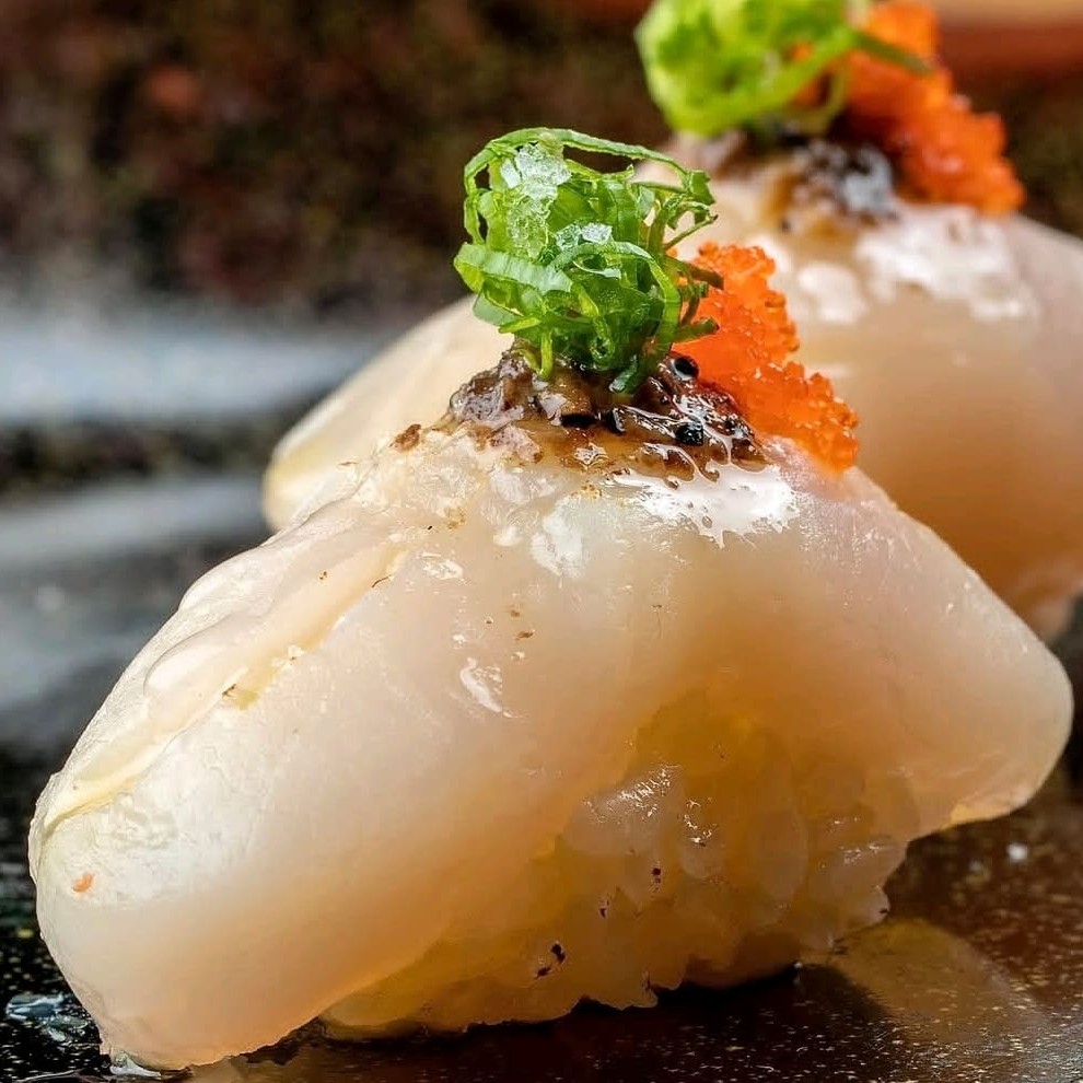 Delicioso niguiri de Vieira finalizado com azeite trufado, molho especial ovas e cebolinha trazendo um sabor incrível para o paladar